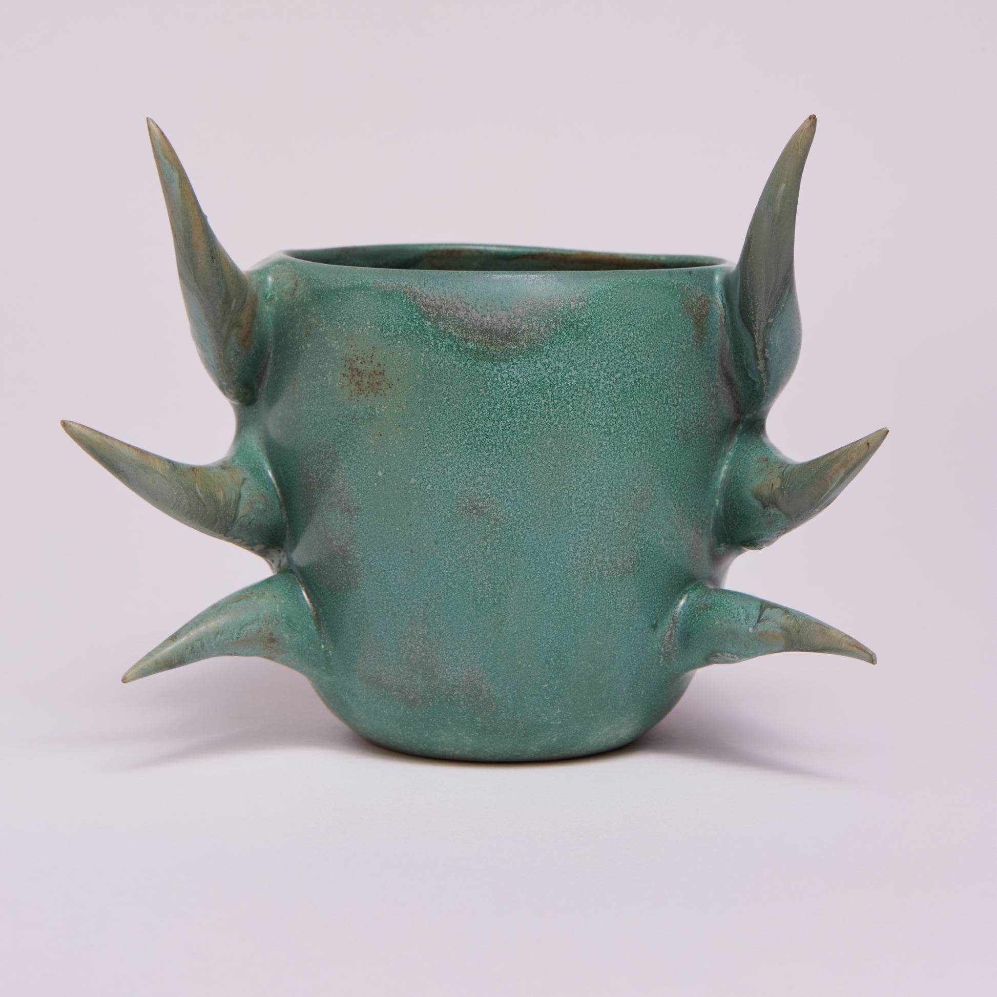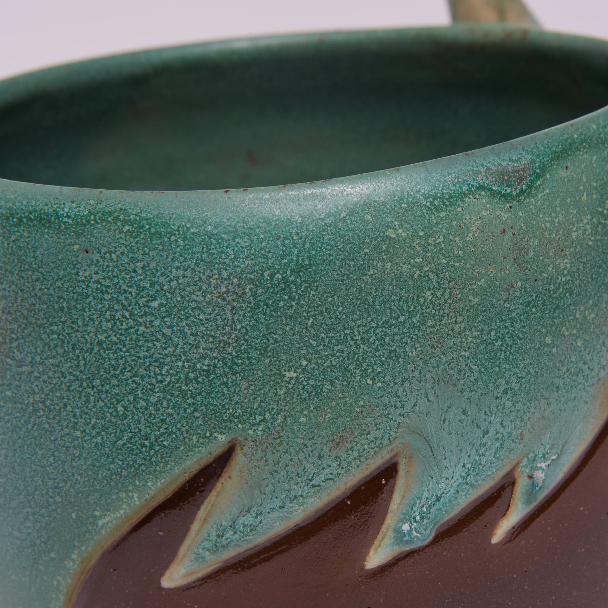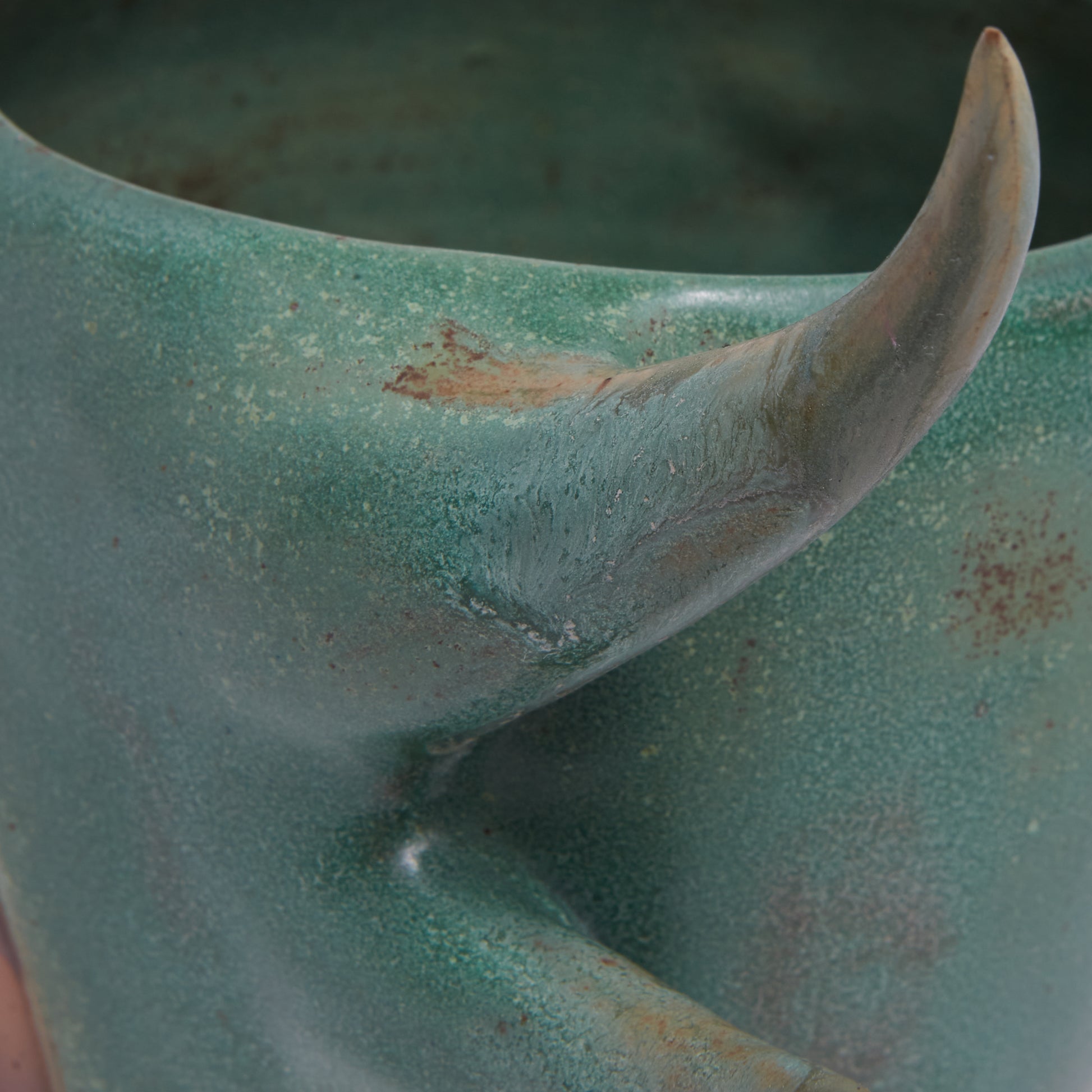 Hand-made ceramic vessel. This piece is thrown on the wheel, hand-sculpted, then it is fired in a kiln, glazed for coloring, then fired once again for final product. Each piece is one of a kind. No piece is perfect and there may be small imperfections.